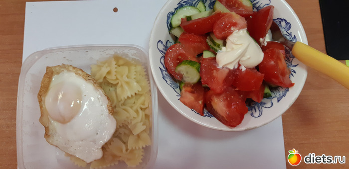 Обед:Вермишель, яйцо и салат из овощей со сметаной (забыла зелень нарвать)