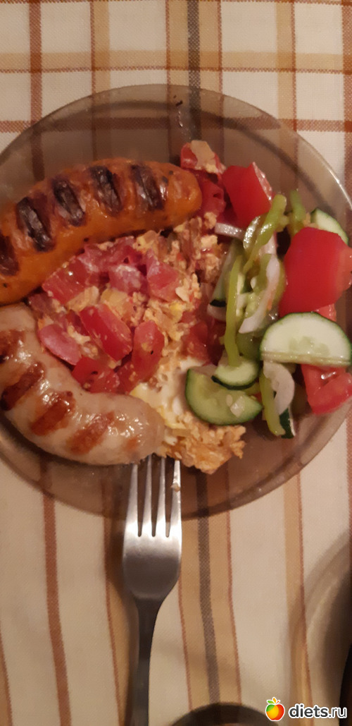 Ужин:Омлет (из яйца, помидора, лука), купаты (муж устроил угощение на гриле), салатик с маслом
