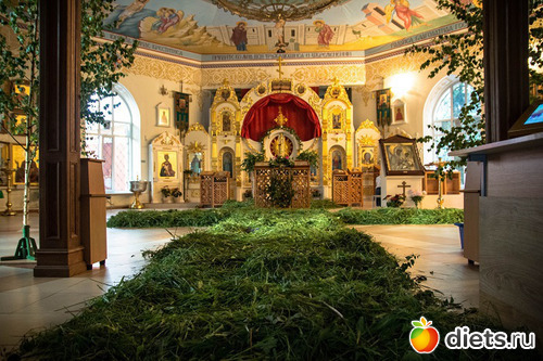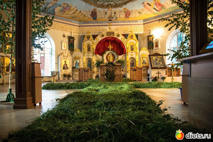 Пятидесятницу часто называют зелеными святками. Церкви в этот день принято украшать свежей зеленью – пол, по традиции, должен быть выстелен свежескошенной травой, а иконы с изображениями ликов Святых обрамляют свежими весенними цветами и свежими побегами деревьев.