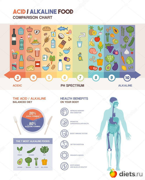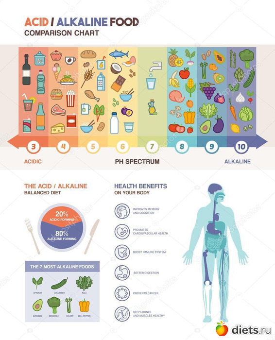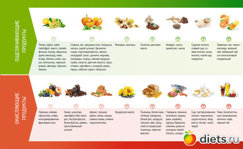 Суть диеты в том, что нужно учитывать одно простое правило: все продукты при переваривании дают либо кислотную, либо щелочную реакцию. И именно это необходимо учитывать, составляя свой рацион.