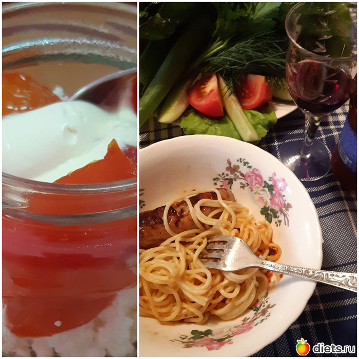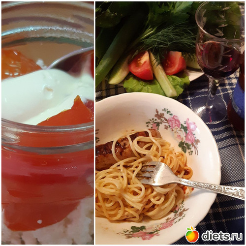 Вечером пожарили колбаски и курочку. Овощи, торт (я его вечером не ела