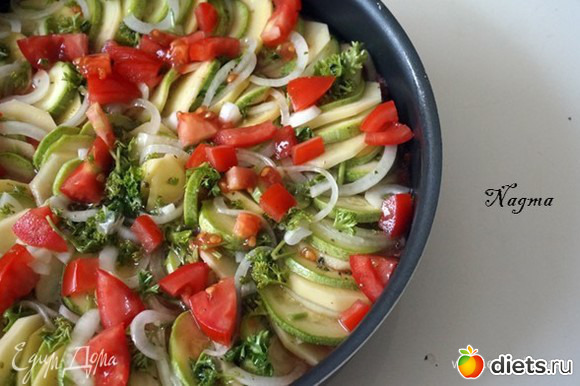 Разложить картофель, цукини и нарезанный лук на сковороде в круговые ряды, чередуя овощи.