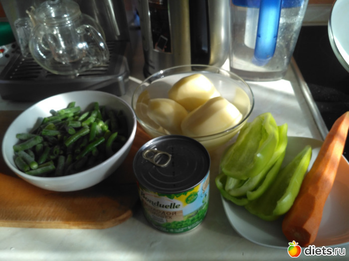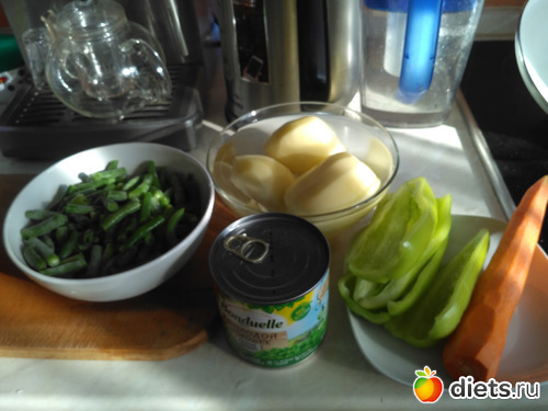 Пол курицы без шкуры поставила вариться с 2 луковицами и 1 стеблем сельдерея,пока варится чистим 3 средних картохи,1 среднюю морковь,2 грунтовых или болгарских перца-режем все кубиком.Из бульона вынимаем лук, сельдерей (я выкидывают),курицу остужаем,отделяем от костей и режем,ну а дальше закидываем морковь,картоху,минут через 5 перец,ещё через 5 стручковую фасоль,чуток провариваем,солим/перчим по вкусу,добавляем банку зелёного горошка.Доводим до кипения и выключаем.Перед подачей добавляем свежую зелень-у меня лук и укроп)