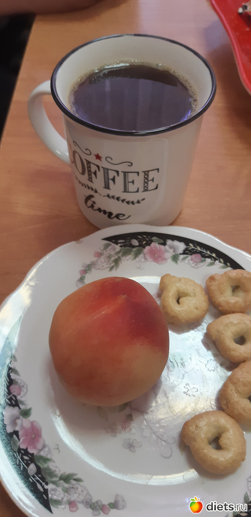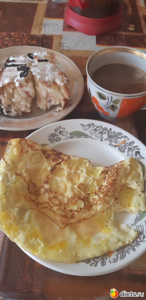 Завтрак:Омлет (яйцо, молоко, сыр), тортик (съела меньше половины, остальное отдала мужу), кофе с молоком.