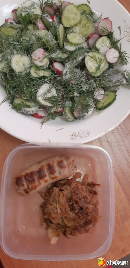 Обед:Капуста тушеная, колбаска, салат из редиса, огурца, зелени и сметаны