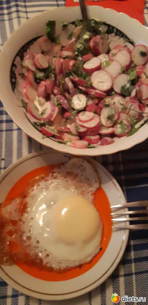 Ужин:Яйцо жареное, салат из редиса. Потом жутко захотелось семечек (совсем чуть-чуть)