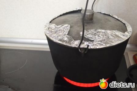 На подставку кладём сыр. Крышку оборачиваем фольгой с внутренней стороны и закрываем