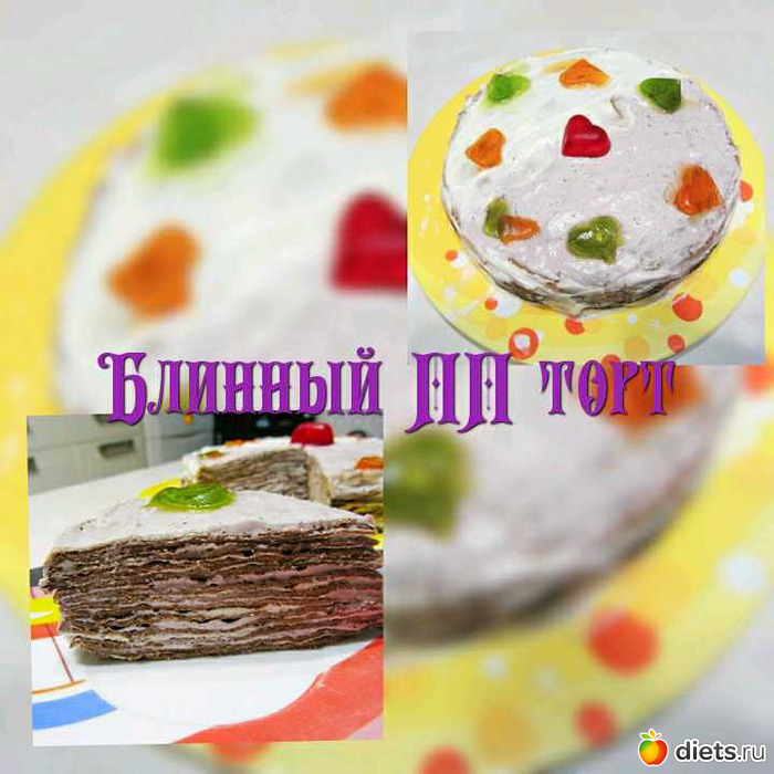 3 коробочки по 180 г мягкого творожка до 5% жирности взбить миксером добавляем 3 ст ложки обезжиренного сухого молока, 10 мерных ложек Фит-Парада, ароматизатор крем-брюле. Кремом перемазать блинчики и сверху и сбоков наш тортик, украсить мармеладом без сахара. Или любое украшение на Ваш выбор. Ставим в холодильник до утра для пропитки.