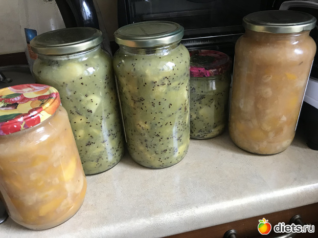 Я уже несколько лет варю "варенье" на основе банана. Разминаю вилкой банан, добавляю любые фрукты, чуть-чуть сахара, кипячу и в банку. Сегодня первая партия- персик+банан, вторая - киви+банан. На 4.5 литра у меня ушло 300гр сахара. Я его добавляю для того, чтобы появился первый сок у фруктов. Получается по факту не столько варенье, сколько фрукты в собственном соку. Ими я потом поливаю творог.