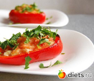 Полученной начинкой наполнить перцы и уложить их в глубокий противень. Подлить немножко воды. Запекать в духовке (180-200 гр) около 30 мин.