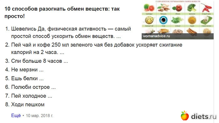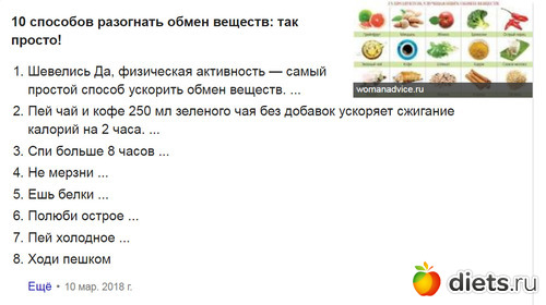 1. Не голодайте. Любая диета замедляет обмен веществ, а потом его очень сложно разогнать;
