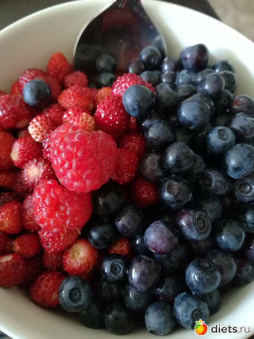 Полдник. Мисочка ягод - черника, земляника, малина.