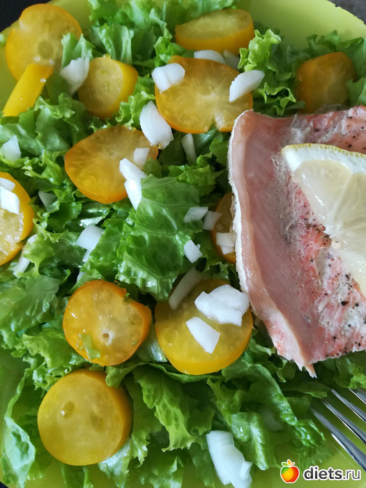 Обед. Большой салат (зелёный салат, жёлтый помидор и лук). Запечённый лосось. Привезла с собой много огородных овощей, лесных ягод. До конца недели хватит, вкус конечно у них обалденный по сравнению с магазинами.