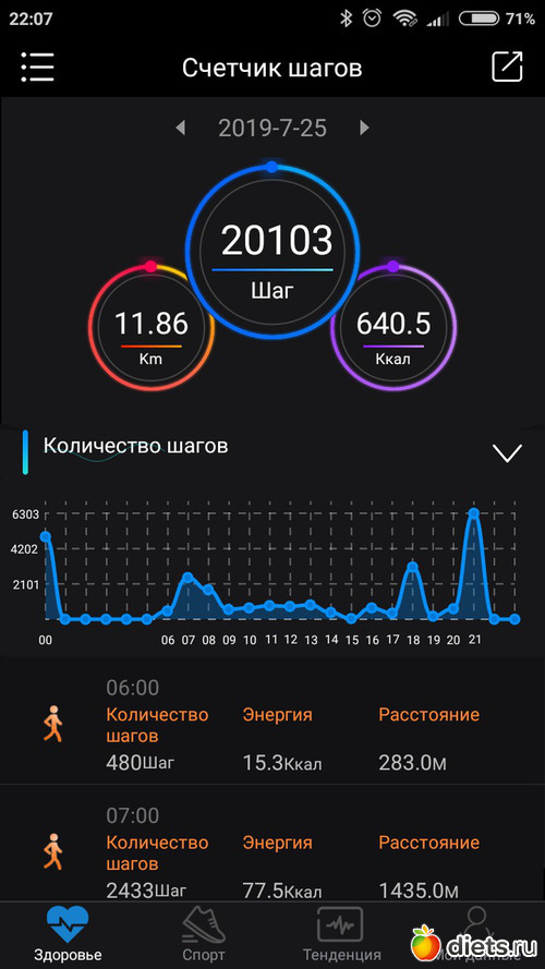 Лирическое отступление: сегодня первый день моего общения с фитнес-браслетом. Что я могу сказать: или у меня бракованный браслет или телефон терял примерно треть моих шагов. За месяц пользования шагомером в телефоне я вывела, что обычный мой день равен 6000 шагов, плюс занятие около часа - еще 6-7 тысяч. Итого к концу дня набегало около 13-14 тысяч шагов. Браслет мне показал сегодня 20000. Причем львиная доля погрешности ушла на рабочие часы, шаги во время тренировки приблизительно те же.