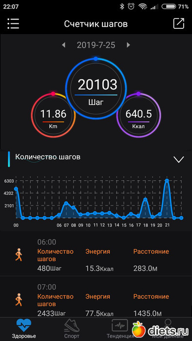Лирическое отступление: сегодня первый день моего общения с фитнес-браслетом. Что я могу сказать: или у меня бракованный браслет или телефон терял примерно треть моих шагов. За месяц пользования шагомером в телефоне я вывела, что обычный мой день равен 6000 шагов, плюс занятие около часа - еще 6-7 тысяч. Итого к концу дня набегало около 13-14 тысяч шагов. Браслет мне показал сегодня 20000. Причем львиная доля погрешности ушла на рабочие часы, шаги во время тренировки приблизительно те же.