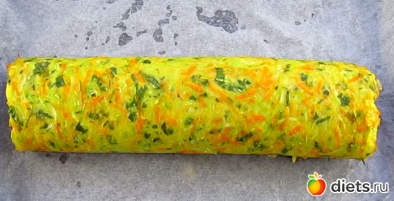 6. Готовый кабачковый корж достать из духовки, дать немного остыть, корж накрываем пергаментом, сверху кладем разделочную доску, переворачиваем и аккуратно убираем пергамент.