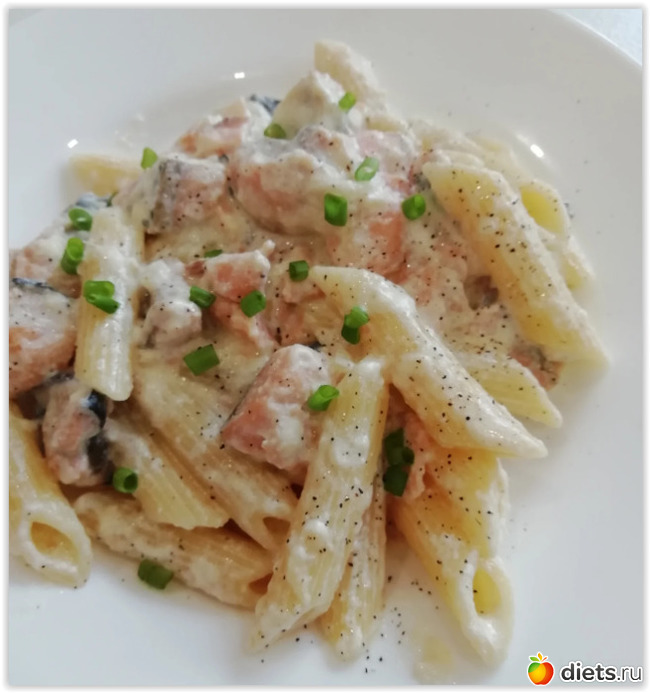 Паста готова, перекладываем ее на сковороду, добавляем еще немного тертого сыра (пару столовых ложек), перемешиваем и раскладываем по тарелкам. Сверху посыпаем немного перцем, зеленью и наслаждаемся потрясающим вкусом!