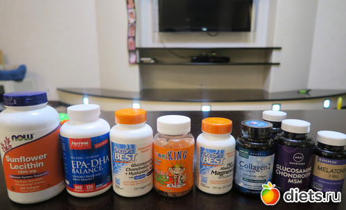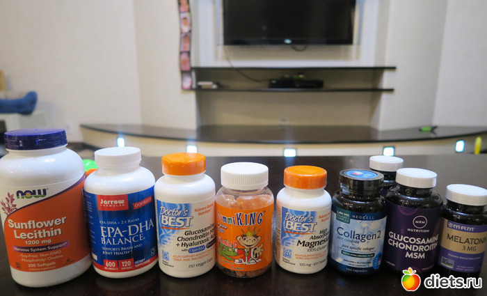 Самая большая баночка - лицетин, следом - омега, пятая - магний. Всё это надо комплексно, для суставов и мышц. Вместе с коллагеном и глюкозамином это даёт хороший результат.