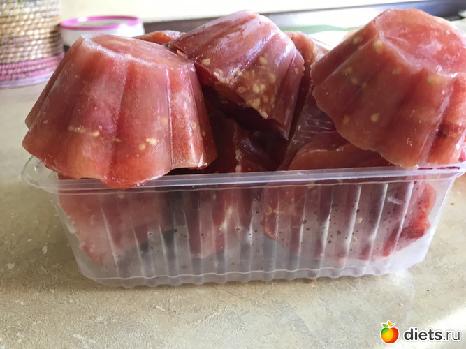 Подумала, а ведь можно заморозить не в формочках, а выложить ровно на противень, заморозить, потом завернуть в плёнку и на дно морозильной камеры. Пласт займёт места намного меньше, чем формочки. А зимой вытащил, отломил и назад.