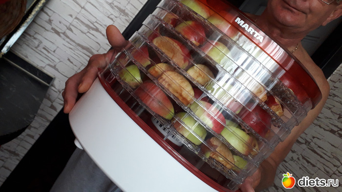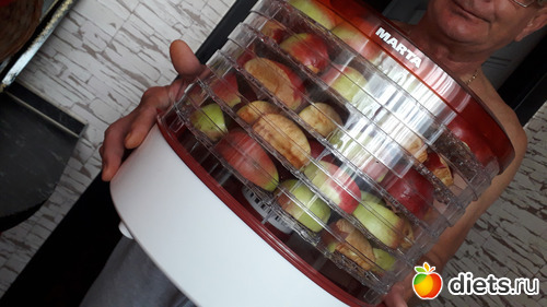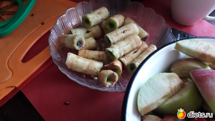 Вот сейчас-сушу дачные яблоки в электросушилке. Для этого яблоки нарезаю кусочками. Но остается частенько много отходов!