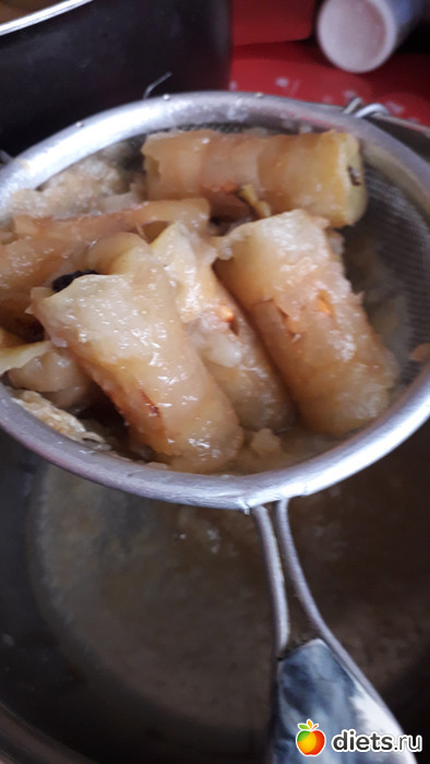 Все, что остается, заливаю очень маленьким количеством воды и хорошо провариваю! Частенько я даже протираю через сито, мякоть останется в компоте-в этом фруктовом концентрате!