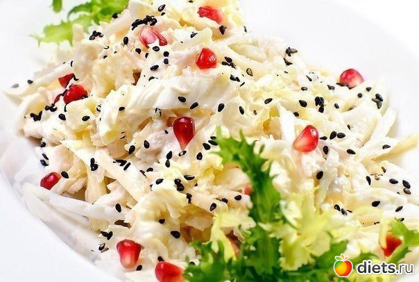 5. Кусочки курицы смешайте с капустой, сверху посыпьте сыром, кунжутными семечками и зернами граната, заправьте оливковым маслом и бальзамическим уксусом. Салат готов. *Можно также добавить 2 помидорки или болгарский перчик (можно всё вместе) ** Также можно приготовить другие заправки: первый вариант: в майонез добавить сок 1 лимона и чёрный молотый перец. второй вариант: жидкая сметана, сок лимона, оливковое масло, соль.