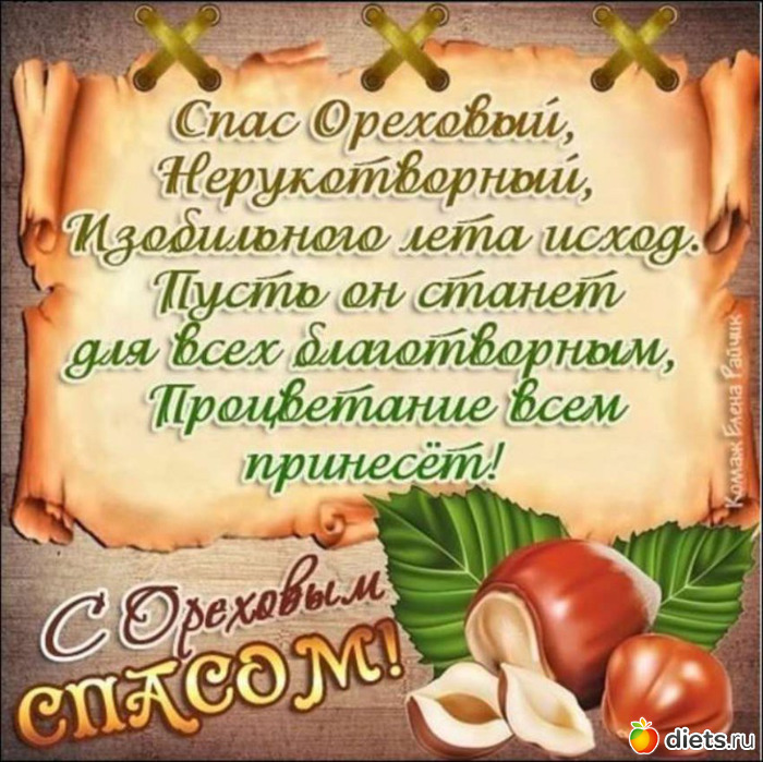 Поздравляю с Ореховым Спасом. Пусть Господь всегда спасает от бед и лиха, пусть ангел ваш никогда не покинет вас,пусть семья укрыта будет от зависти и злобы прочной оболочкой из душевной доброты, взаимной любви, заботы, верности и благополучия, как укрыт орех своей скорлупой. Желаю здравия и долгих лет жизни.