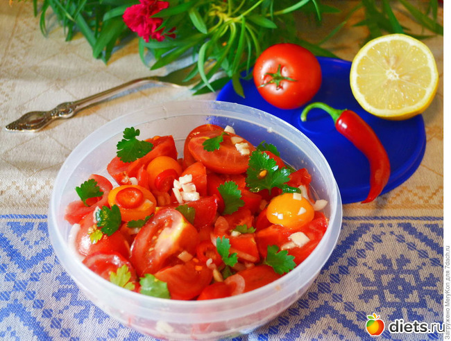 Приготовить маринад: все ингредиенты для маринада тщательно смешать. Теперь необходимо залить наши овощи маринадом. Может показаться, что маринада мало, но не стоит волноваться — помидоры тоже дадут сок, и получится вполне достаточно. Теперь нужно хорошо перемешать нашу закуску, закрыть крышкой и поставить в холодильник на пару часов (мы обычно не выдерживаем).