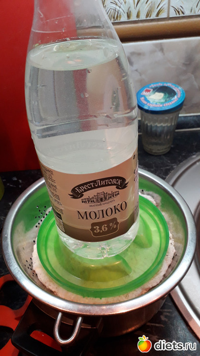 3. Дуршлаг выстелить 2 слоями марли, процедить массу. Сверху положить блюдце и груз весом 1-2 кг. Оставить в таком положении до полного остывания.