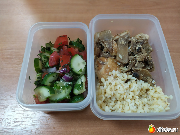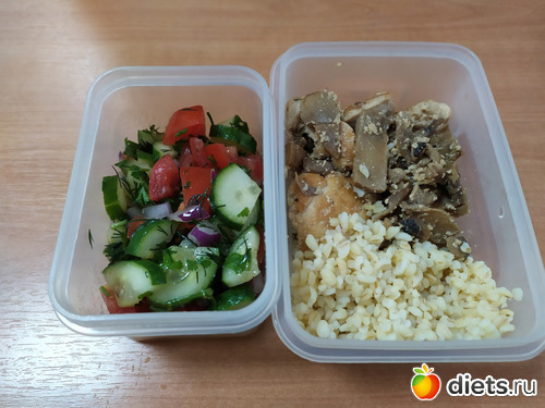 Булгур с фитнес-грудкой и грибами, салат из огурцов и помидор