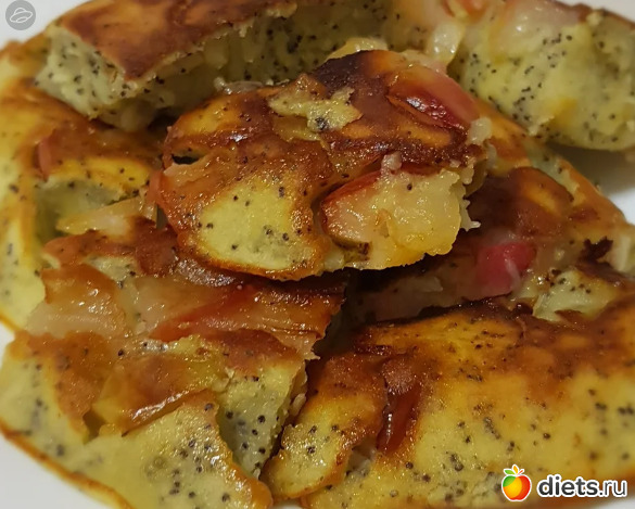 Пока яблоки жарятся, готовлю тесто. Взбиваю яйца с сахаром, добавляю молоко, муку и разрыхлитель. Все перемешиваю с помощью миксера. Тесто должно получиться примерно как на оладьи, может чуть гуще. В самом конце добавляю мак.