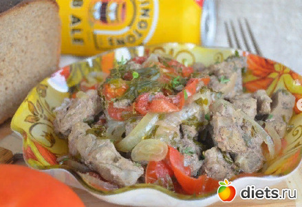 Накрыть печенку слоем лука и помидоров, посыпать оставшейся петрушкой.