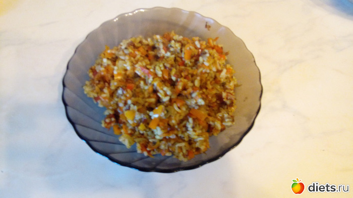 Вот состав:Рис (пропаренный, коричневый, красный) (50 г), Морковь красная (65 г), Лук репчатый (65 г), Перец красный сладкий (65 г), Шпинат (50 г). Получилось 374 г. Калорийность - 242 ккал.