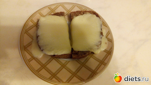К сожалению, я на улицу не хожу в связи с болезнью, поэтому крипсов не было. Был только хлеб собственного изготовления: мука пшеничная и ржаная цельнозерновая пополам. Взяла два кусочка по 20 г. Сверху сыр пошехонский 45 % и легкий 27 % по 20 г. Бутерброды разогрела в микроволновке. Калорийность 391 ккал.