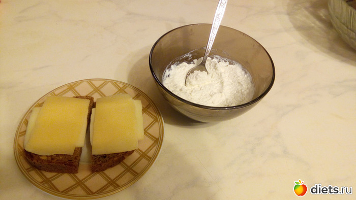 К сожалению, я на улицу не хожу в связи с болезнью, поэтому крипсов не было. Был только хлеб собственного изготовления: мука пшеничная и ржаная цельнозерновая пополам. Взяла два кусочка по 20 г. Сверху сыр пошехонский 45 % и легкий 27 % по 20 г. Бутерброды разогрела в микроволновке. Калорийность 391 ккал.