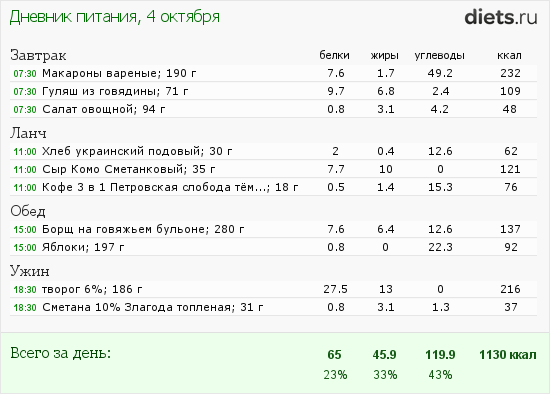 Сегодня утром варила макароны и думала - ну нифига себе у меня сегодня день калорийный будет, ведь я же себе еще и бутербродики с сыром на второй завтрак сделала. А нет - всего 1150 калорий за день. Вечером порцию творога доедала через силу, хоть и мечтала о нем три дня. Читать полностью