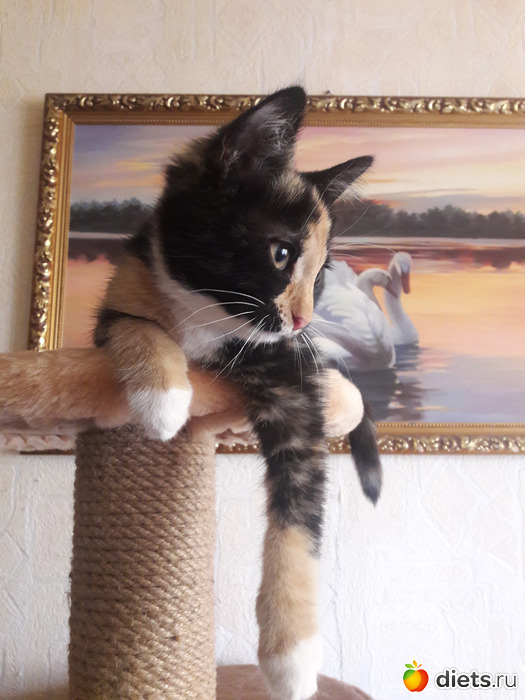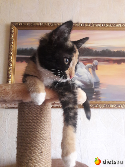 Привет твоей кошачьей семье от нашей, уже повзрослевшей Бориски, ей уже примерно месяцев 8, а нашла я её такую же как твоя Моня!!!