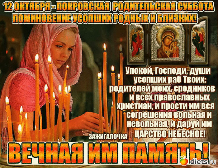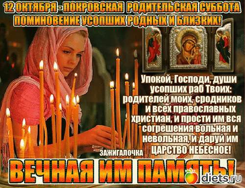 На Покровскую субботу принято поминать вначале умерших родителей, затем других родных или близких людей, которые отошли в мир иной. В отличие от вселенских родительских суббот, на Покровскую молятся не обо всех умерших, а только о тех, кого вспоминают живые родственники. После храма можно сходить на кладбище, чтобы прибраться на могилках. А затем уже устроить поминальную трапезу в кругу семьи.