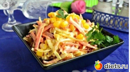 Добавить в салат измельченный чеснок и консервированную кукурузу.