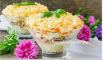 Готовый салат отправим в холодильник на 1-2 часа, чтобы он настоялся. Перед подачей украсим салат свежей зеленью. Также для декора можно использовать кружочки маринованных огурцов, вареную морковь или перепелиные яйца.