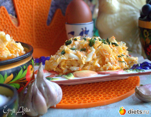 Яйца отварить заранее (примерно 6 минут после закипания) и лучше тоже натереть на крупной терке для однородной текстуры салата.