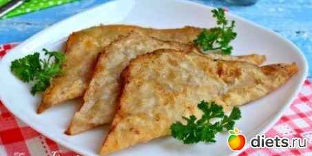Сковороду разогреть с растительным маслом (масла не нужно наливать слишком много), выложить подготовленные "чебуреки". Жарить на среднем огне до румяного цвета с двух сторон.