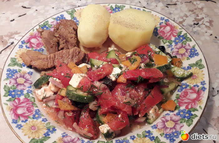 (больше в ноябре картохи не будет) по традиции 2 штучки и к ней греческий салатик и чутка грамм 30 говядинки и да, я обожралась