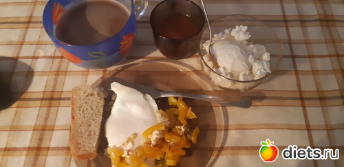 Завтрак:Поздно, в 10-00. Омлет (яйцо, лук, перец), кусочек хлеба, творог со сметаной и мёдом, кофе с молоком.