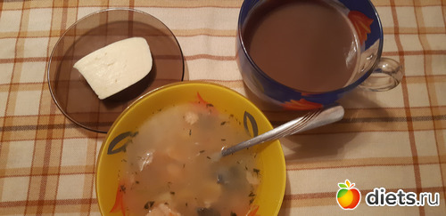 Обед:Поздно, в 16-00. Так что, он же ужин. Суп рыбный, сыр сулугуни, кофе с молоком.