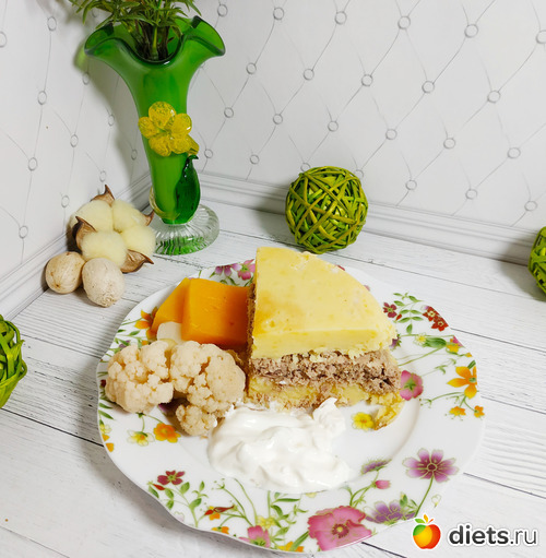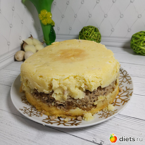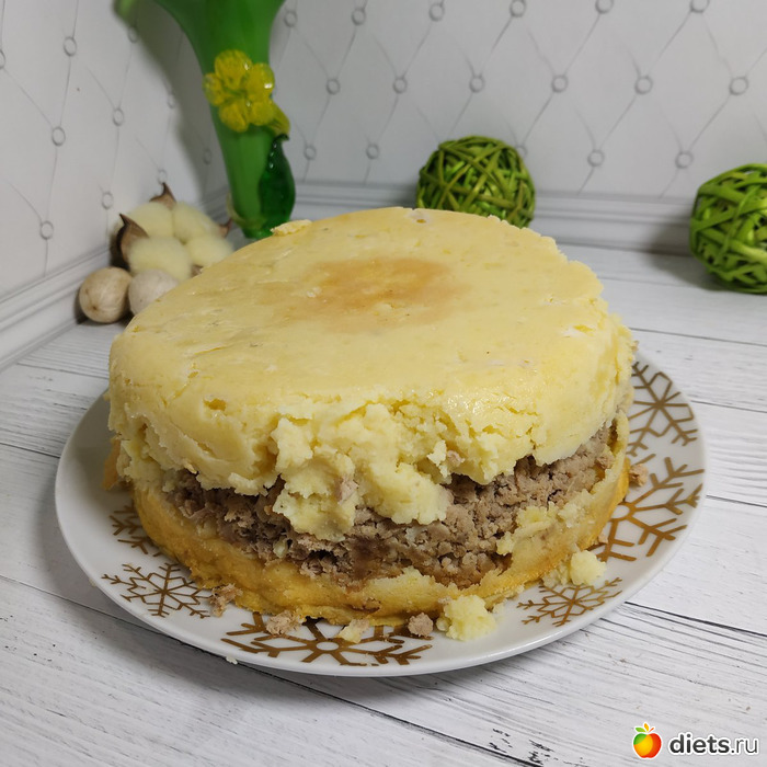 Подготовить картофельное пюре, добавив кипяченое молоко, сырое яйцо и соль. Полученную массу тщательно перемешать, половину пюре положить ровным слоем на смазанную растительным маслом и посыпанную сухарями форму. Сверху положить фарш (из провернутого отварного мяса) и оставшуюся часть пюре, разровнять, смазать яйцом и запекать в духовке 20—30 мин.