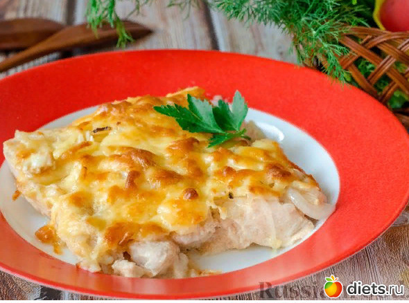 Филе с луком равномерно посыпаем тертым сыром. Отправляем куриное филе с сыром в духовку на 20-30 минут.