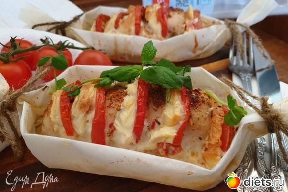 Из пергамента делаем лодочку и выкладываем в нее курицу. Куриное филе будет запекаться в собственном соку и получится сочным.