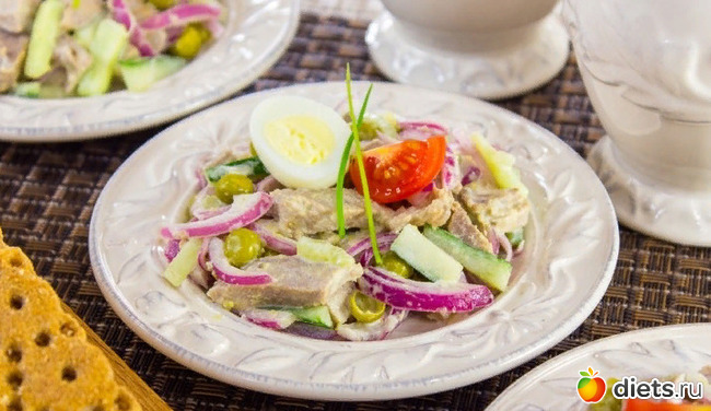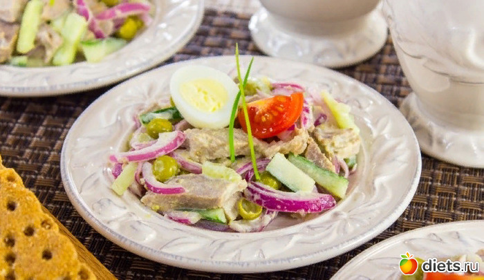Смешать язык, огурцы, горошек, лук (маринад слить).