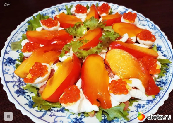 Между хурмой кладем перепелиные яйца, которые нужно разрезать пополам. Поверх яиц выкладываем по пол чайной ложки красной икры. В центре украшаем по желанию листьями салата или петрушкой.